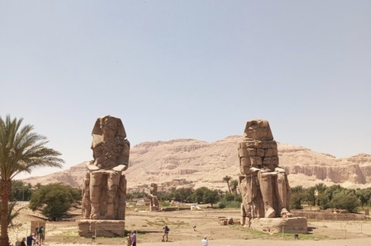 Vēl mums jāredz Memnona kolosi – gigantiskas (aptuveni 18m augstas, 1000 tonnu smagas) sēdošas akmens statujas, kas attēlo faraonu Amenhotepu III ar skatu pret Nīlu. Tās senāk bijušas daļa no Amenhotepa III tempļa. Statujas savu nosaukumu ieguvušas pateicoties uzrakstiem grieķu un latīņu valodā, kas atsaucas uz grieķu mitoloģijas karali Memnonu, kurš senāk kļūdaini tika uzskatīts par statujas pārstāvi.