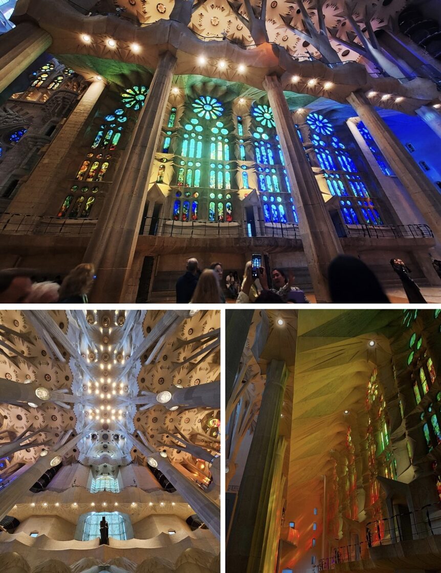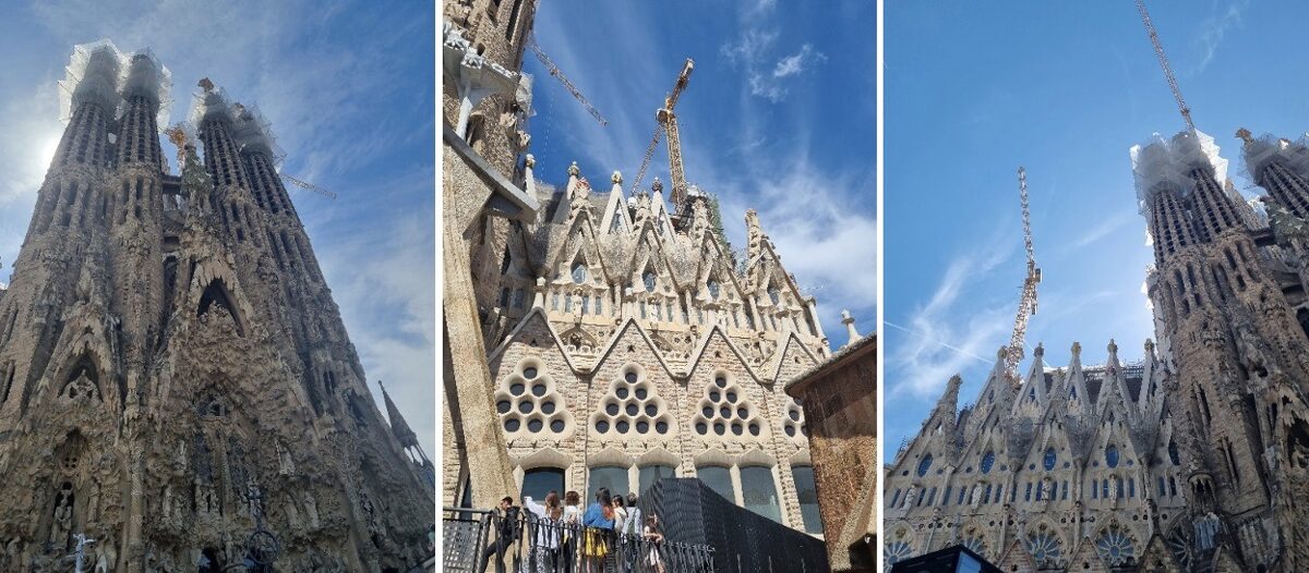 Dosimies skatīt grandiozāko Gaudi mākslas darbu – La Sagrada Familia jeb Svētās Ģimenes katedrāli. Interesanti, ka jau, būvniecības darbus pārņemot un rasējot katedrāles plānu, gan pārējie arhitekti, gan būvnieki un vietējie teica, ka tik augstus torņus nav iespējams, uz ko Gaudi esot nesatricināmi atbildējis- kad darbs būs nonācis līdz torņu būvēšanai, tam jau būs piemērotas tehnoloģijas. Un patiesi! Katedrāle pašlaik atrodas pēdējā būvniecības stadijā- tiek būvētas noslēdzošās torņa smailes un krusts, kurā būs iespējams ieiet iekšā. Tā kā Spānijas valsts baznīcu būvēšanu nesponsorē, arī Svētās ģimenes katedrāli būvē par ziedojumiem un ieejas biļešu maksu , pandēmijas periodā neienākušie tūristu līdzekļi baznīcas apskatei nozīmēja naudas izsīkumu un darbu apstāšanos. Darbi nu atsākti, tomēr katedrāles pabeigšanas datums ik gadu tiek celts arvien uz priekšu. Ar vietējo gidu noskaidrosim neoficiālo pašlaik plānoto katedrāles darbu pabeigšanas gadu (pērn tika lēsts, ka tas būs 2030.gads un arī tas vēl nav akmenī kalts).