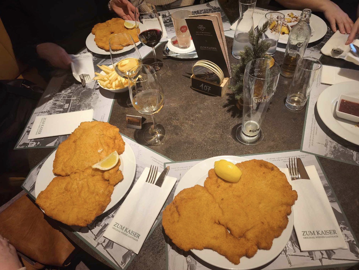 Protams, obligāti baudāma ir Vīnes šnicele (Wiener Schnitzel)- plāni klapēta teļa gaļa gaisīgā, kraukšķīgā mīklas panējumā, pasniegta ar brūkleņu mērci, citronu un kartupeļiem. Īpaši salāti, ko pasniedz ar šo karbonādi, ir kartupeļu salāti. Pērn grupā esošie kungi brīnījās, tos saņemot- auksti! Jā, lai arī kā piedevu var pasūtīt vārītus, ceptus vai kā citādi pagatavotus kartupeļus, klasiski karbonādi ēd ar aukstiem vārītu kartupeļu salātiem – kartupeļi ripiņās, ar sīpoliem, marinādi un zaļumiem. Ļoti austriski!